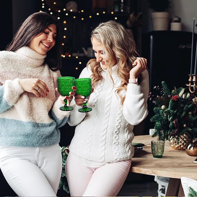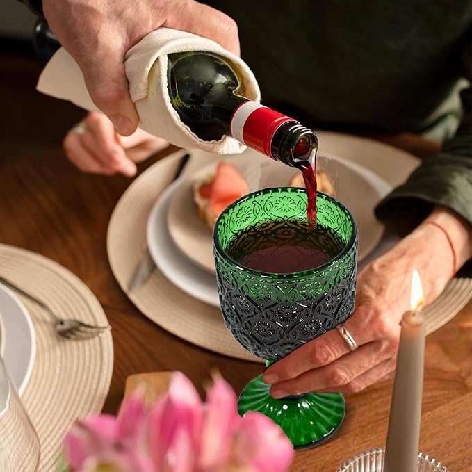 Vintage Wine Glasses Set of 6, 12 OZ Christmas Green Glass Water Goblets, Embossed Floral Decorative Crystal Glass Cups Set, Dishwasher Safe, for Wedding, Party, Red Wine Glass, Bars, Restaurants