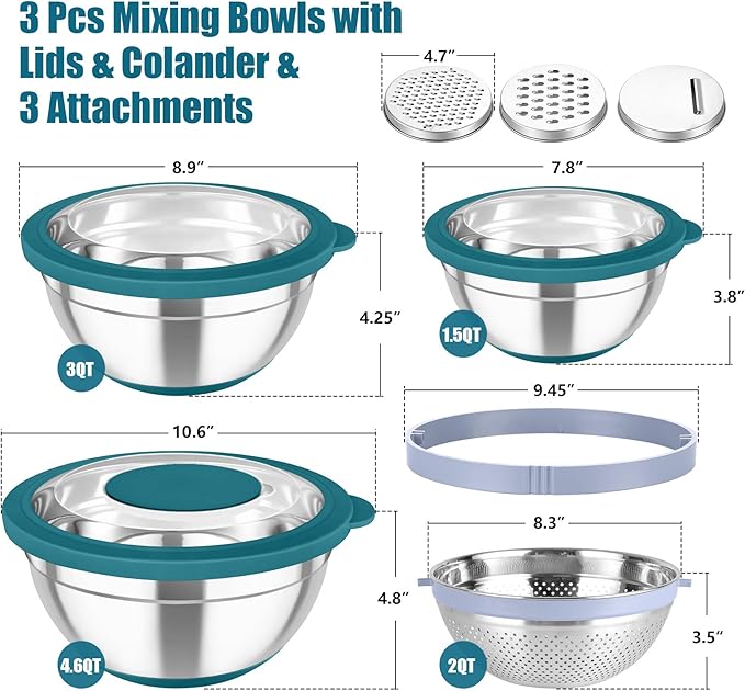 - 3 SIZES & MULTIFUNCTIONAL: This nesting bowls set includes 3 different sized bowls (4.6 / 3 / 1.5 QT) with lids, 1 colander (2 QT) and 3 grater attachments, Great for large / small portions needs: Washing fruits, Straining pasta, Grating carrots, Preparing meal, Storing food, Mixing salad, Whipping eggs, Kneading dough, Marinating meat and portable for taking outside, A multifunctional helper for home kitchen and outdoor activities, Also an ideal choice for bakery and restaurants