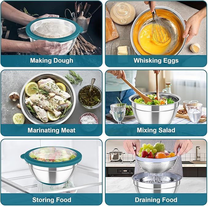 - VISIBLE AIRTIGHT LID & NONSLIP BOTTOM: Airtight lids fit snugly for food storage, Keep your food fresh and avoid food spilling or leaking, Transparent section effortless and clear for you to see-through what's inside without opening the lid, The non-slip silicone bottom stably keeps the salad bowl in place on the countertop and reduces noise while mixing / beating / whisking, The stainless steel mixing bowls can be stacked one inside the other, Saving storage space and keeping your kitchen neat