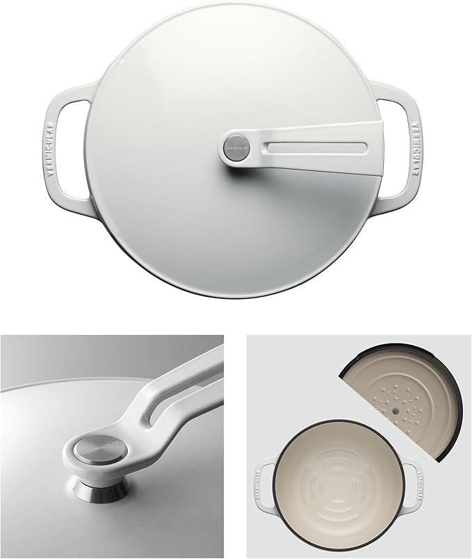 • Instant Evaporation: With Vermicular’s proprietary enamel coating, the pot quickly eliminates surface moisture, making the pot ideal for fast cooking methods like searing, stir-frying, and steam-roasting.