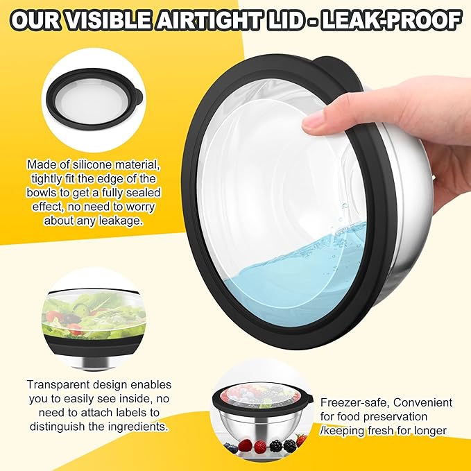 • HEALTHY & HEAVY DUTY: Our mixing bowls are made of pure stainless steel without any toxic coating or harmful substances and the airtight lids are constructed by food grade plastic and silicone, No other chemical substances leaching when during food preparation, Healthy for everyday use, Sturdy stainless steel to avoid rust and deformation, For a longer service life