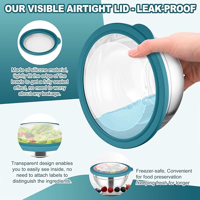 • HEALTHY & HEAVY DUTY: Our mixing bowls are made of pure stainless steel without any toxic coating or harmful substances and the airtight lids are constructed by food grade plastic and silicone, No other chemical substances leaching when during food preparation, Healthy for everyday use, Sturdy stainless steel to avoid rust and deformation, For a longer service life