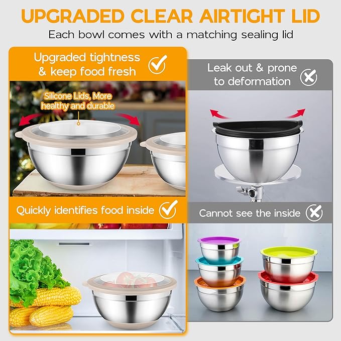 • Healthy & Durable: mixing bowls are made of quality stainless steel to prevent rust, dents and offer reliable durability, transparent lids are crafted of food-grade plastic and silicone for healthy use