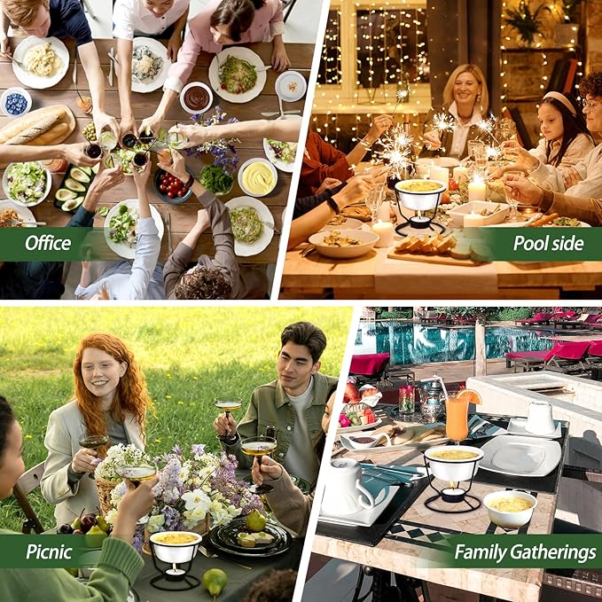 - 【5.07oz Individual Sweet Bowl with Decent Size】The 4Pcs Fondue Pot Set with 20 Tea light candles for free. Each bowl measure 3.93inch top diameter and 3.62inch height,with 5.07oz(150ml) large capacity. The metal stand is 3.39inch height.Stackable design did not waste space in the cupboard.