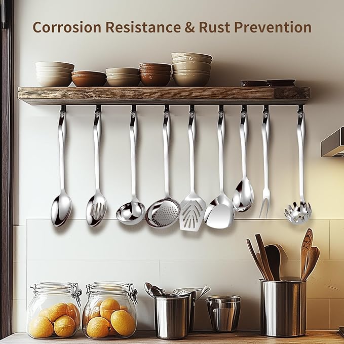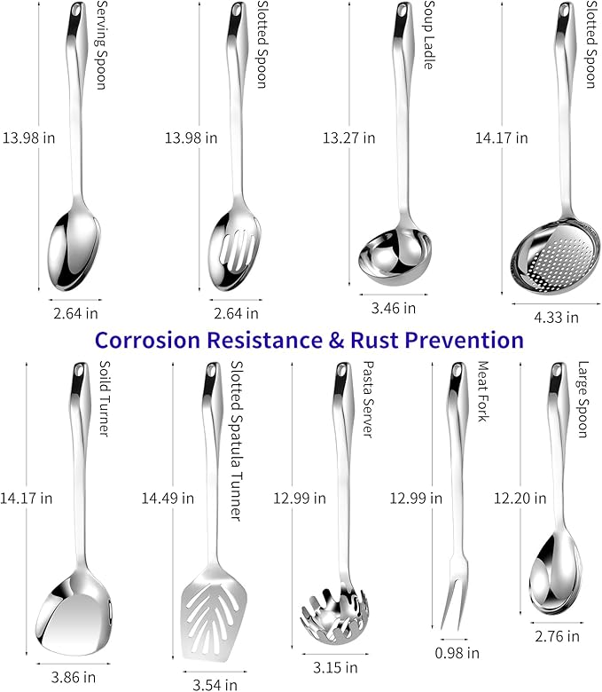 • 【9Pcs Kitchen Utensils Set】: Lazycorner Utensils Serving Set consists of 1 Soild Turner, 1 Soup Ladle, 1 Slotted Spoon, 1 Slotted Spatula Tunner, 1 Pasta Server, 1 Large Spoon, 1 spaghetti spoon, 1 Serving Spoon, 1 Slotted Spoon, 1 Meat Fork. Enhance your cooking experience with 9 PCS Kitchen Utensil Set Metal Cooking Utensils that perfectly for your cooking needs