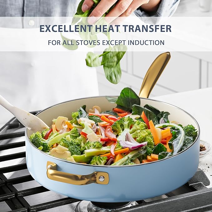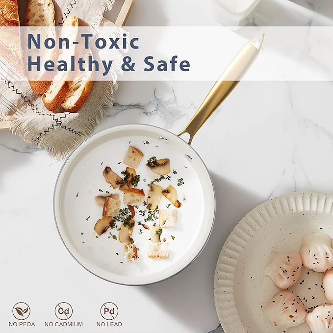• 【Non Toxic Ceramic Coating】- Ceramic pots and pans set nonstick are free of PTFE, PFOA, PFAS, lead, cadmium and other toxic materials, 100% safe for you, your family, and the environment