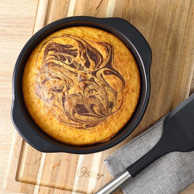• A BOX CONTAINS: Two 9-inch round cake pans, one 9-inch loaf pan, one 13-inch cookie sheet and one 12-cup muffin pan from the Oster Platinum Collection