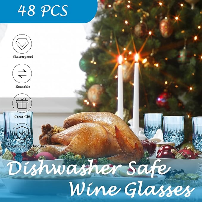 • 🍷🍷🍷【Product Description】 This set includes 48 retro-style dusty blue party plastic wine glasses, providing ample quantity to meet your daily use and replacement needs. The elegant and sophisticated design makes your wedding reception unique