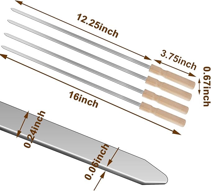 • Sturdy and Rigid Design: These 16-inch flat skewers for grilling are made from high-quality stainless steel, ensuring they remain hard and straight even under high heat. Perfect for grilling various ingredients without bending or deforming