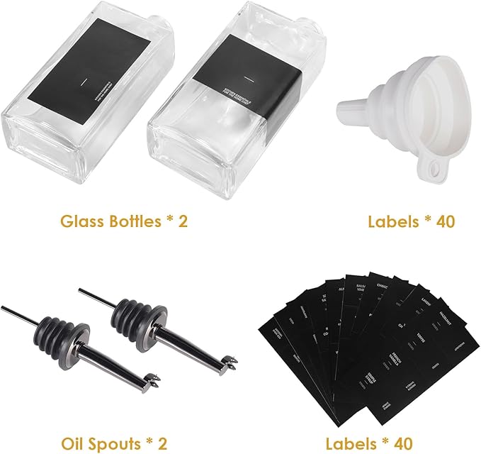 • [VERSATILE OIL DISPENSER SET] OKYUK Oil dispenser set comes with 2 * glass oil bottles, 2 * drip-free oil spouts, 1 * silicone funnel, and 40 * labels. These oil dispensers are suitable to use for your kitchen, and they are also practical for holding or dispensing oil, vinegar, soy sauce, cooking wine, or mouthwash. This 2pcs oil dispenser bottle set meets most of your daily needs and is perfect to share with your lover, family, and friends