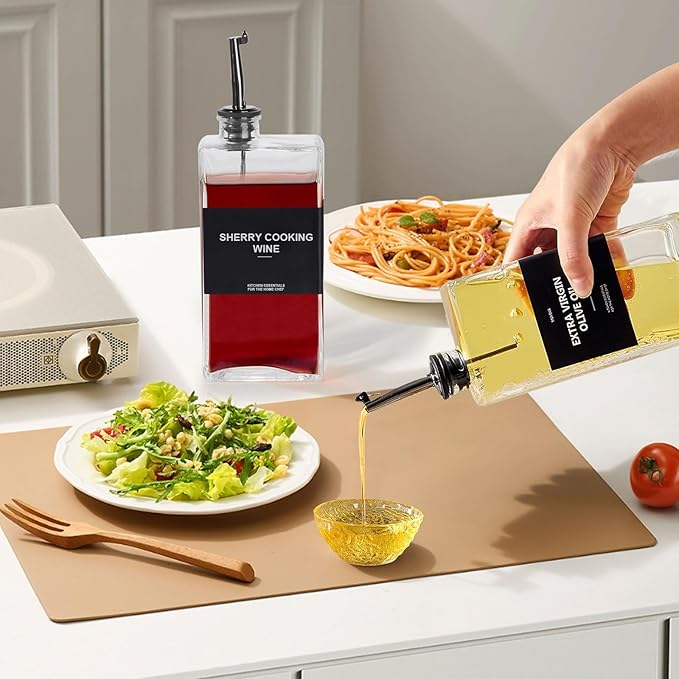 • [HIGH QUALITY & UPGRADE DESIGN] Our cooking oil container is made of superior quality BPA-FREE glass, combining a shatterproof body with a 304 stainless steel spout, rustproof and lightweight, ensuring controlled liquid flow, and preventing any spillage and leakages from staining your countertop. Moreover, each pouring spout has a seal ring, and the cap is fully closed when not in use, keeping your liquid ingredients fresh and original
