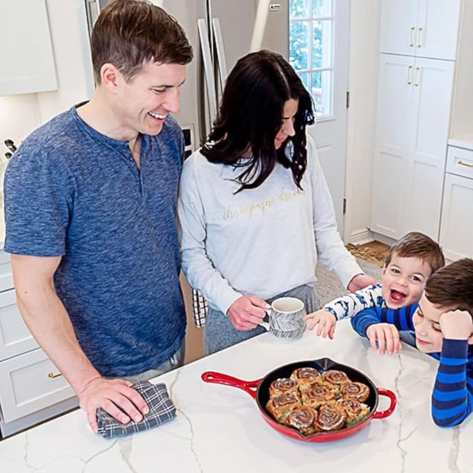 • Versatile Cast Iron Skillet: Our 10.25-inch enameled cast iron skillet is compatible with all cooktops, perfect for any cooking method from stove to oven. Plus, our skillets feature pour spouts for effortless serving and draining, offering a seamless cooking experience.