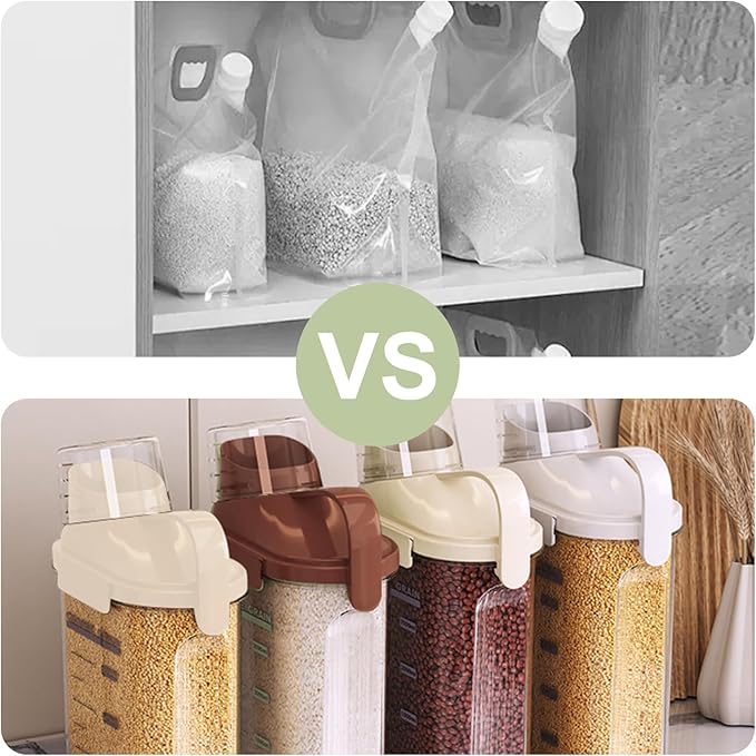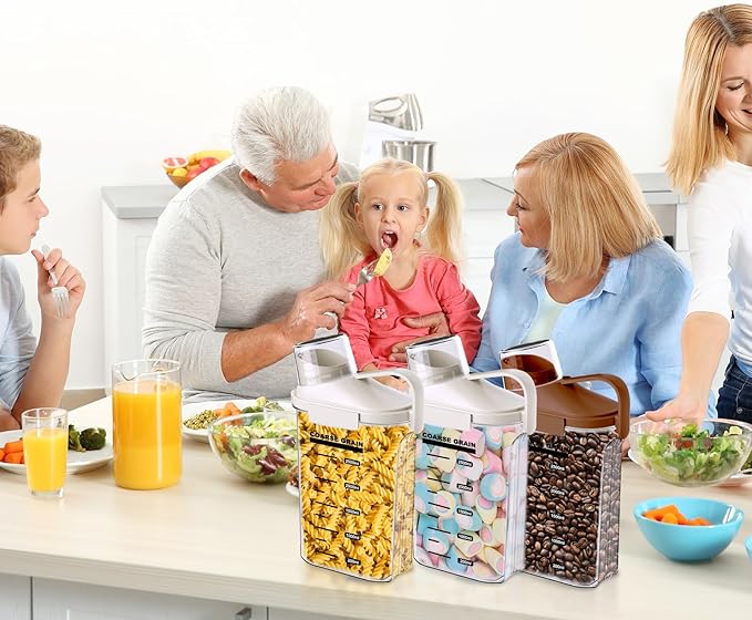 • Bpa Free, Food Grade Plastic:Crafted from high-quality, food grade materials, these clear food storage containers are designed to be durable and safe for storing dry products. ATTENTION: PACKAGE INCLUDES: 3 x 2500ML CEREAL DISPENSER(2 White+1 Brown).