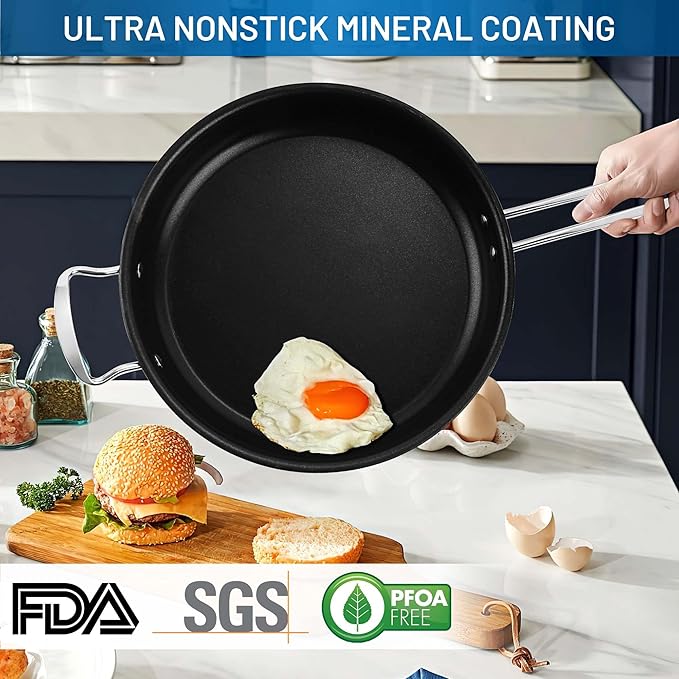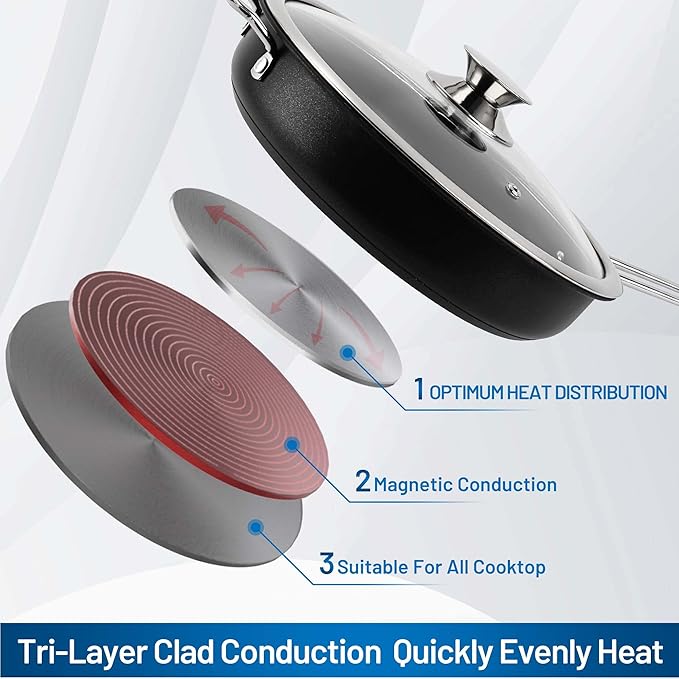 • Built to Last - Our pots and pans boast a 3-ply premium stainless steel base with a thick aluminum core for even heat distribution and outstanding durability. Non-toxic and resistant to discoloration, this cookware won't react with food or affect flavors, ensuring safe and healthy meals. Experience faster cooking with reduced hot spots that can burn food, saving both time and energy!