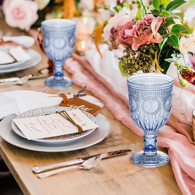 48 Pack Vintage Wine Glasses, Plastic Reusable 12 Ounce Colored Water Goblets, Unique Flower Embossed Pattern Unbreakable Stemmed Wine Glasses High Clear Wedding Party Bar Drinking Cups Blue