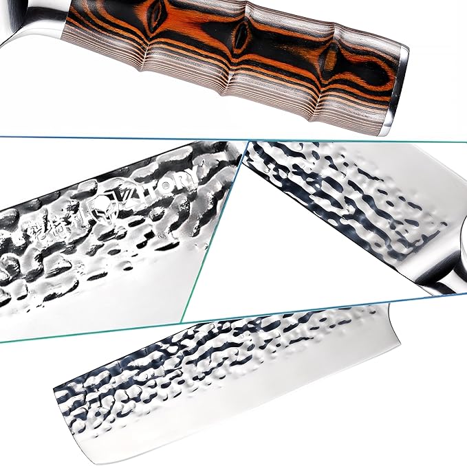 • SLEEK HAMMERED FINISH: The nakiri knife's hammered blade design not only adds aesthetic appeal but also reduces drag while cutting, preventing food from sticking, and the hand-polished surface gives it a lustrous shine.