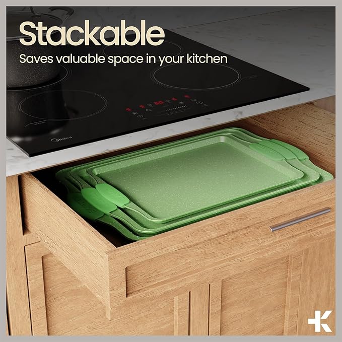 • SPACE-SAVING DESIGN: This stackable baking pan set comes with utensils and is perfect for any kitchen, very versatile for baking muffins, cookies, and more. Its space-saving design allows easy storage, making it ideal for home and professional kitchens.