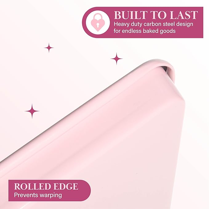 • FASHION MEETS FUNCTION: The versatile 15" x 10" baking sheet is perfect for cookies, pastries, sheet pan dinners and more. The two-tone pink and cream instantly upgrades your kitchen!