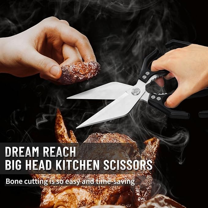 • Precision Cutting Made Easy: Dream Reach Big Head Series chicken scissors are crafted from premium 3Cr13Mov stainless steel, designed to effortlessly handle raw or cooked meat, poultry, seafood, and more. With their razor-sharp, heat-treated blades, cutting through ingredients has never been smoother or more efficient.