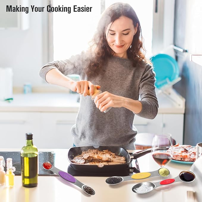 • Magnetic measuring spoons set: Double-sided magnetic stainless steel measuring spoon, round end is suitable for measuring liquids,they also lay flat on the table without spilling their contents. The oval end is suitable for measuring dry ingredients and fit into most spice jars. This measuring spoons set includes :1tbsp, 1/2tbsp, 1tsp, 3/4tsp, 1/2tsp, 1/4tsp, 1/8tsp, 1/16tsp, plus leveler.
