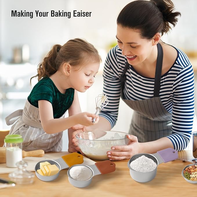 • Magnetic measuring cups set:Double-sided magnetic stainless steel measuring cup design of silicone fingerprint anti-slip particle handle, feel comfortable, anti-slip, easy to grip.This measuring cups set includes :1 cup, 3/4 cup, 2/3 cup, 1/2 cup, 1/3 cup, 1/4 cup, 1/8 cup.
