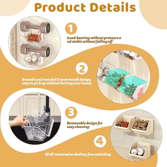 • 🌿[SPACE SAVING] You will get 3 wall basket storages, each storage box measures 5.5 x 3.7 x 3.9 inches. These adhesive spice rack are compact and designed for small spaces, perfect for use in the bathroom, kitchen or cabinets to maximize space. They can be easily cleaned with mild soap and water to keep the organizer clean and tidy.