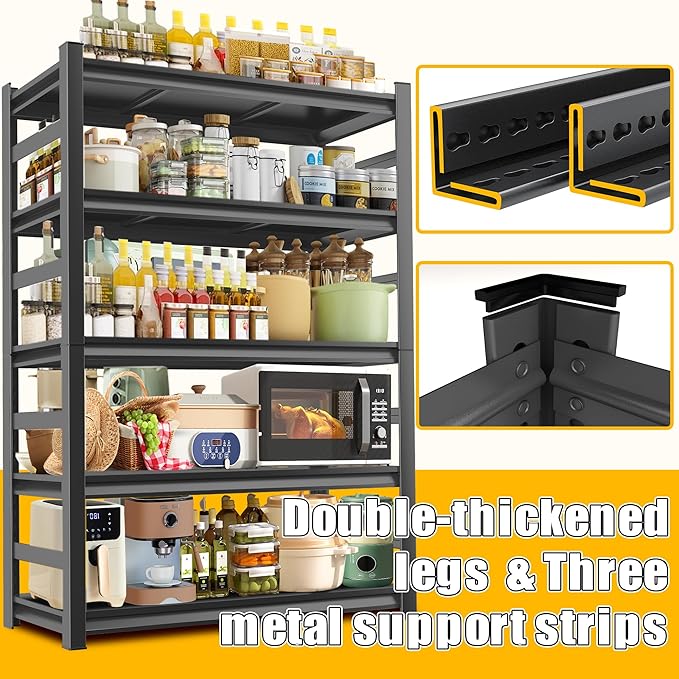 - 【2300LBS Load Capacity Kitchen Shelves】LEARISO kitchen storage shelves are designed with thickened double rolled edge columns, high quality metal dividers and upgraded divider support rods. Each tier can hold up to 560 lbs, with a total weight capacity of 2800 lbs, making the 5-tier kitchen shelves more stable and solid for storing more items.