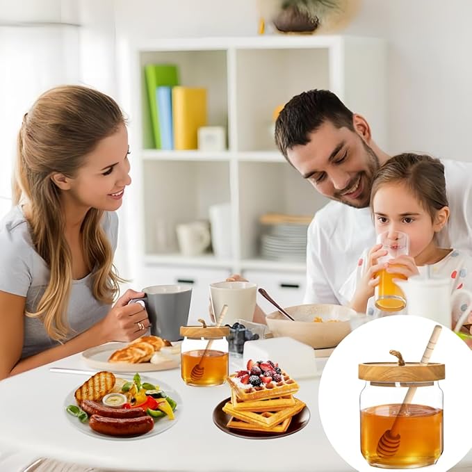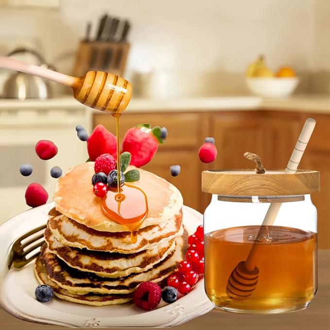 • Safe and Premium Material: Our 15oz honey pot made of high-quality thick glass which is strong and durable. The wooden honey dipper lid is made of 100% natural wood