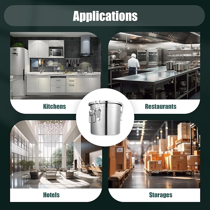 • Large Capacity: This stainless steel canister (D11.02*H9.84in) has a large capacity of 12L/3.17Gal, allowing it to store more items. It is ideal for storing rice, flour, cereals, tea, spices and other food in kitchens, hotels, restaurants, warehouses, living rooms, etc.