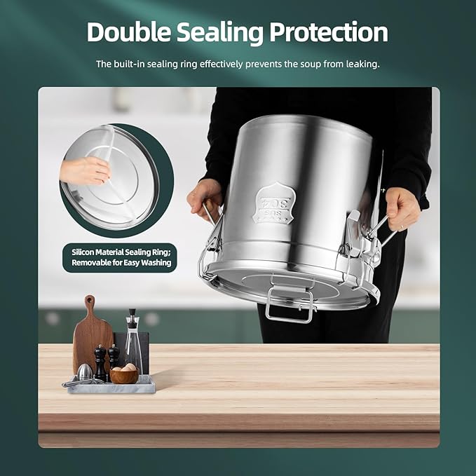 • Double Sealing Protection: Three strong sealing buckles firmly lock the bucket body and lid without gaps. The built-in sealing ring is highly sealed and can prevent the soup from leaking.