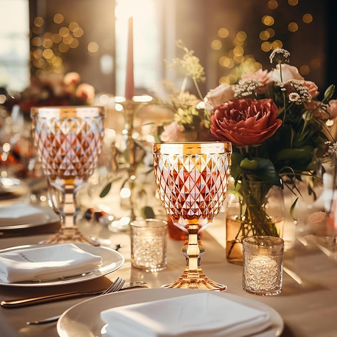 24 Pcs Vintage Wine Glasses, 10 Ounce Colored Glass Water Goblets, Unique Embossed Pattern High Clear Stemmed Glassware Wedding Party Bar Glass Drinking Cups, Diamond Amber Glasses Set of 24