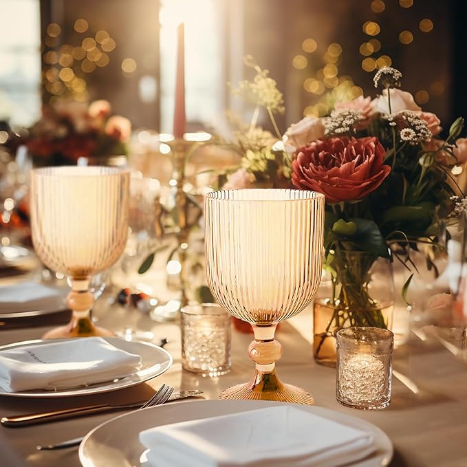 24 Pcs Vintage Wine Glasses, 11 Ounces Colored Glass Water Goblets, Colorful Unique Embossed Pattern High Clear Stemmed Glassware Wedding Party Bar Glass Drinking Cups Vertical Line Amber Set of 24