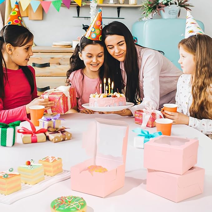 25pcs Pink Small Cake Box,4x4x2.5 Inch Bakery Boxes with Window,gift boxes bulk for Mini Cake Pastry Dessert Strawberries Chocolates Cupcakes with Stickers