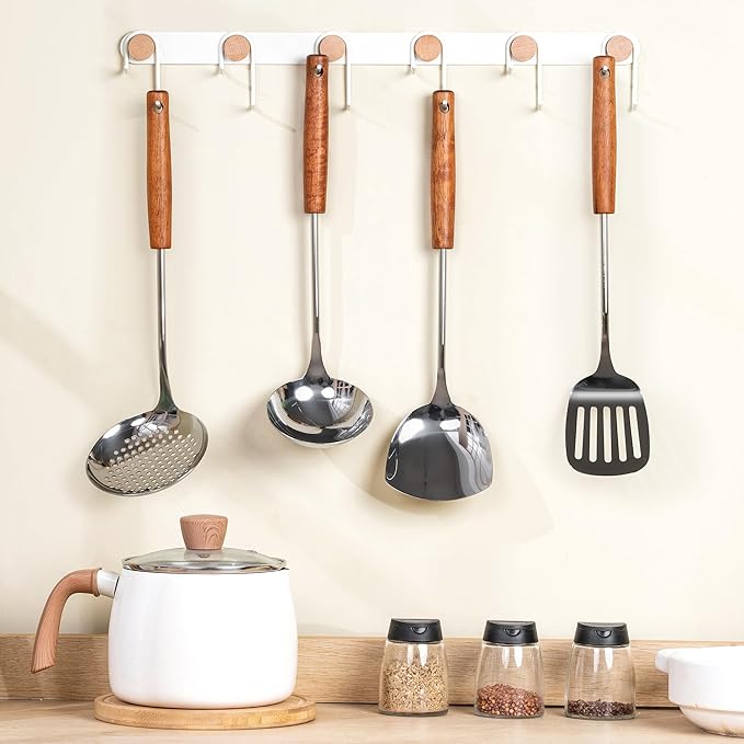 • Easy to clean spatula : Mirror kitchenware will not leave food grease ; Wooden handle with round hanging hole also easy to dry and hang