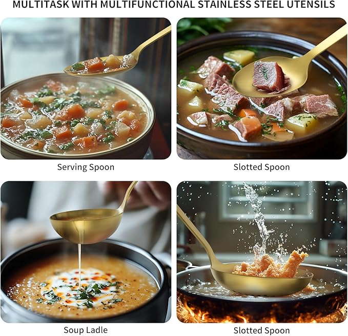 • 【9Pcs Kitchen Utensils Set】: Lazycorner Utensils Serving Set consists of 1 Soild Turner, 1 Soup Ladle, 1 Slotted Spoon, 1 Slotted Spatula Tunner, 1 Pasta Server, 1 Large Spoon, 1 spaghetti spoon, 1 Serving Spoon, 1 Slotted Spoon, 1 Meat Fork. Enhance your cooking experience with 9 PCS Kitchen Utensil Set Metal Cooking Utensils that perfectly for your cooking needs