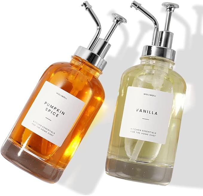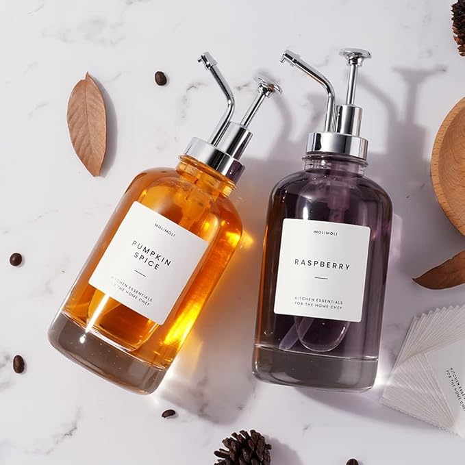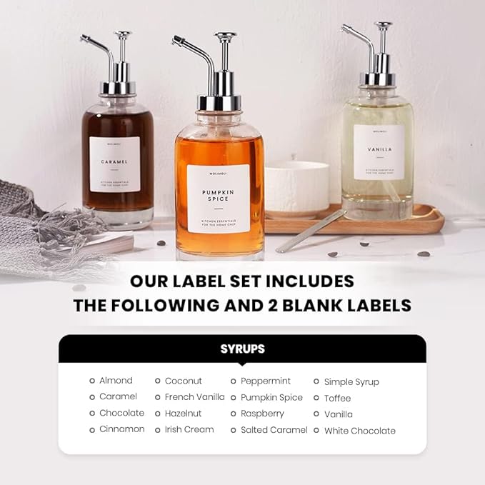 • Coffee Syrup Label Included: Every syrup dispenser set includes a package of custom-designed coffee syrup labels and two blank labels to keep your kitchen organized .