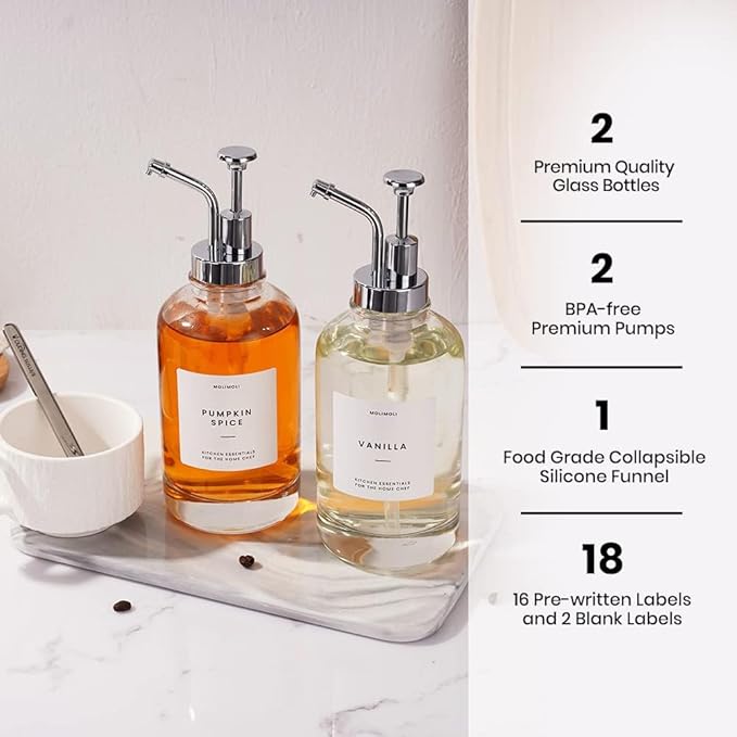 • Molimoli Syrup Dispenser Set: Each Set includes two custom-made high quality coffee syrup bottles, two PVC silver pumps, a funnel and a prefixed label set.