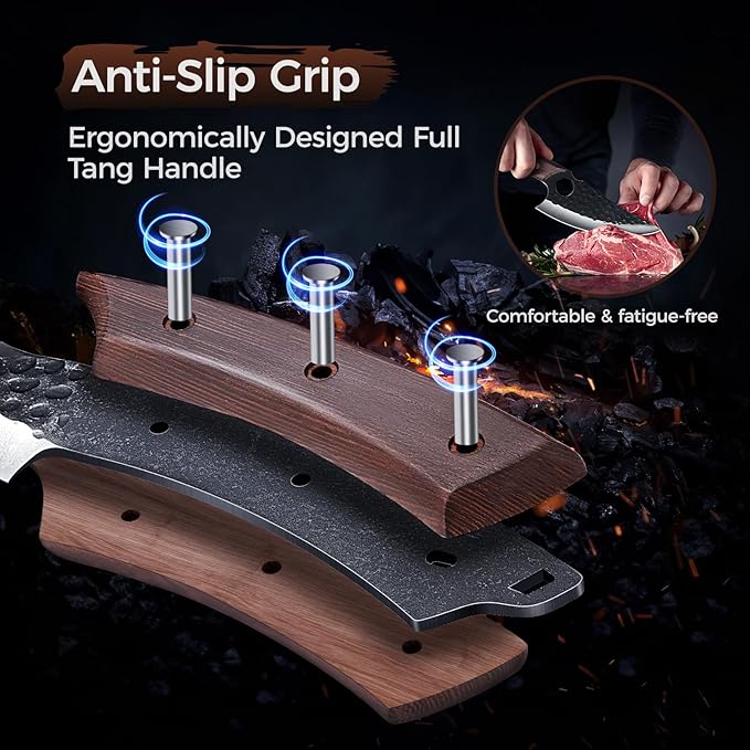 • 【Multifunctional Butcher Knives Set】 The Cleaver Knife Set Include: 6.1" Viking Knife, 7.5" Japanese Meat Cleaver, 7.4" Serbian Chef Knife. A versatile chef knife set can handle everything from cutting vegetables, fruits, and meat to slicing through bones and fish.
