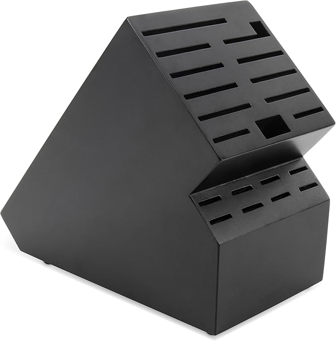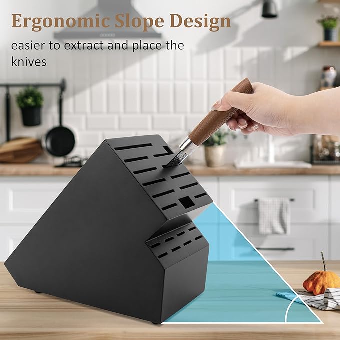 • 20 Slot Universal Knife Block: This kitchen knife block storage holds up to 19 knives, has extra slots to store kitchen scissors and sharpening rod; Excellent slope design, easier to extract and place the knife, each operation is smooth and comfortable.
