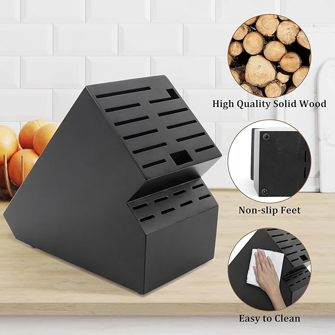 20 Slot Knife Block Storage without Knives,Acacia Wood Universal Knife Holder for Kitchen Countertop,Large Butcher Block Organizer,Easy Kitchen Knife Storage (Black)