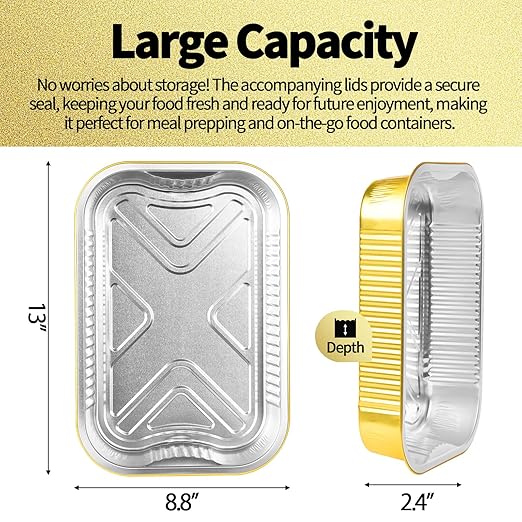 • 9×13 gold foil food container with lid, its extra-thick base is sturdy enough to hold heavy baked foods. They hold their shape easily and are perfect for Thanksgiving turkey, burritos, grilled shrimp and steak, etc. They are also a storage solution for leftovers, meat and salads.