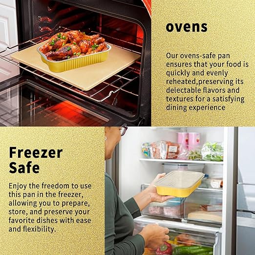 • The gold foil pan is made of high-quality aluminum material, which is twice as hard as other silver foil pans, not easy to deform, high temperature resistant, and can withstand oven temperatures up to 600°F. The food-grade plastic lid has a good seal and is easy to stack.