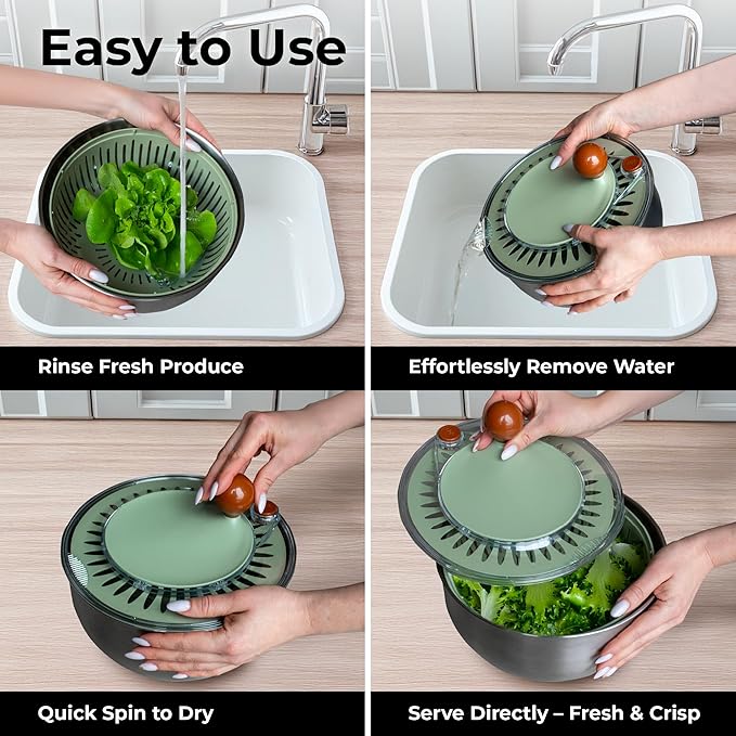 • MULTI-PURPOSE DESIGN - The stainless steel salad spinner inner basket doubles as a colander, and the steel bowl because its large capacity can be used for cooking other foods, as mixing bowl or serving bowl.