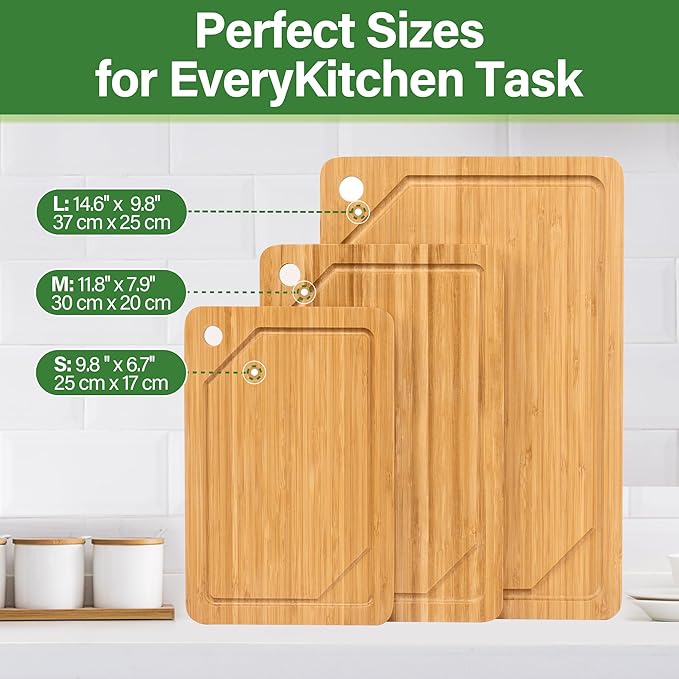 Bamboo Cutting Board For Kitchen, Bamboo Cutting Board Set of 3 with Juice Groove, Double-Sided Chopping Board Serving Board with Hanging Hole for Meat, Vegetables and Cheese
