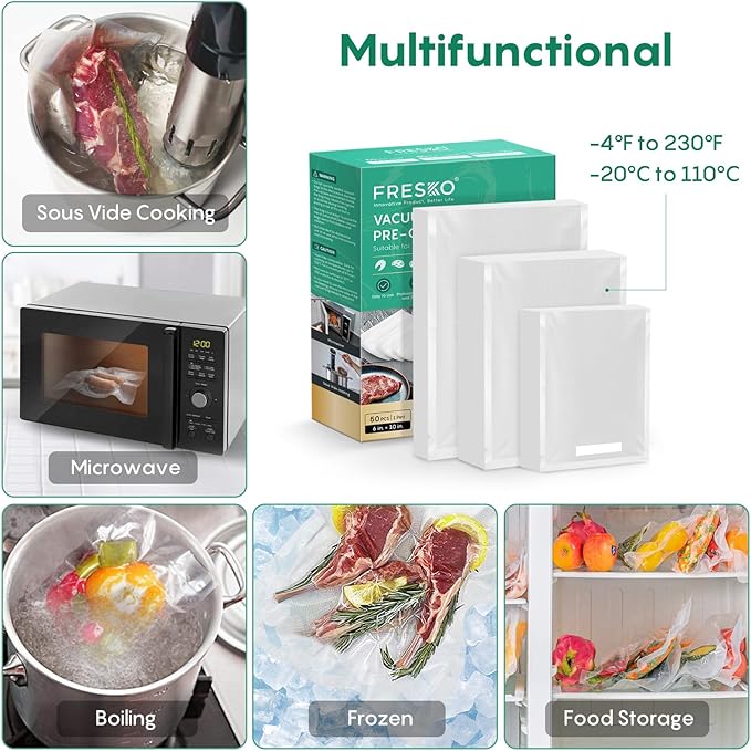 • UNIVERSAL and PRE-CUT: Compatible with all models of vacuum sealers (better with FRESKO food sealer machines). 6"×10" & 8"×12" & 11"×16" pre-cut freezer bags are ready-to-use, saving time to prepare make-ahead meals, and portion bulk items in the freezer