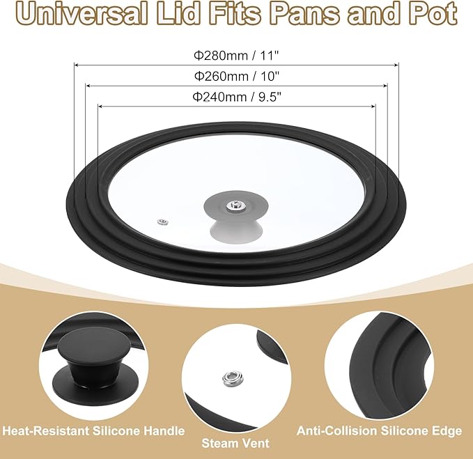 uxcell 1Pcs Universal Lid for Pot Fit 9.5, 10, 11 Inch Diameter Cookware, Replacement Pan Lids with Heat Resistant Silicone Rim, Steam Vent Pan Lid for Pots, Frying Pans, Skillets, Black