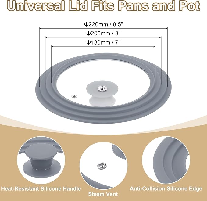 uxcell 1Pcs Universal Lid for Pot Fit 7, 8, 8.5 Inch Diameter Cookware, Replacement Pan Lids with Heat Resistant Silicone Rim, Steam Vent Pan Lid for Pots, Frying Pans, Skillets, Gray