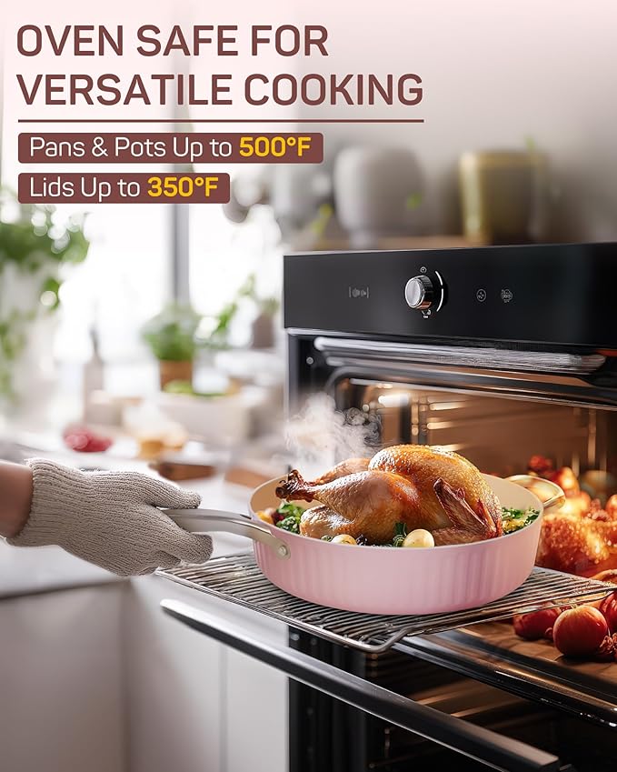 - ใOven Safe for Versatile CookingใTake your culinary creativity to the next level with oven-safe cookware (up to ๐ฑ๐ฌ๐ฌยฐ๐, lids up to 350ยฐF). Seamlessly transition from stovetop to oven for baking, roasting, or finishing dishesโall with one versatile set.