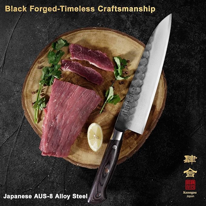 • TIMELESS CRAFTSMANSHIP: The Kanngou gyuto Chef Knife is crafted using traditional Japanese techniques, specifically Kurouchi Tsuchime (Black-Forged). This process gives the gyutou knife a distinctive blackened finish that enhances durability and resists rust. The Tsuchime hammered texture not only looks impressive but also reduces friction, allowing for smoother cuts.