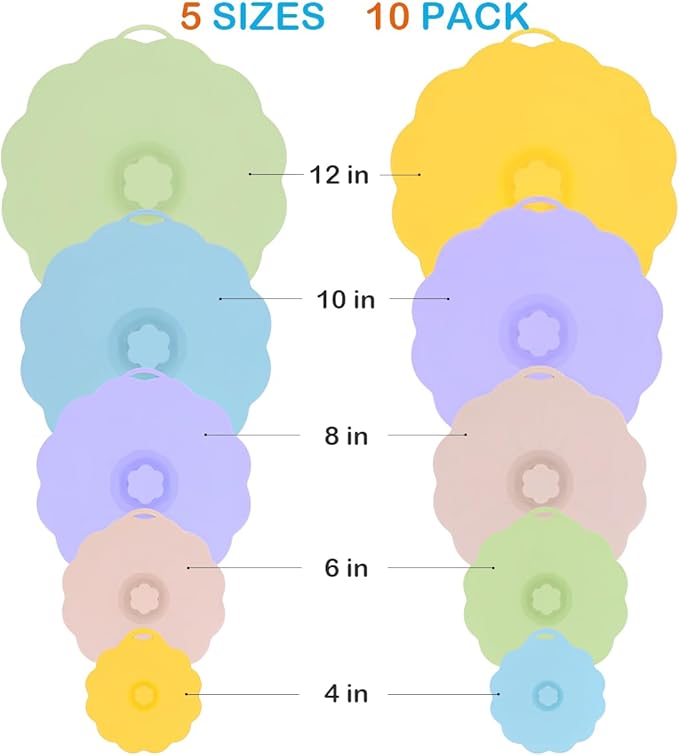 • 【5 Different Size】Our silicone lids fit most smooth rimmed containers including stainless metal plastic and glass. You‘ll get 4" 6" 8" 10" 12" lids 2 each, total 10 pcs.Different colors make it easier for you to identify the right lid.